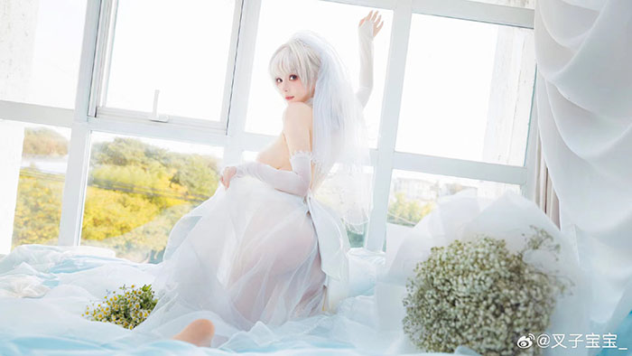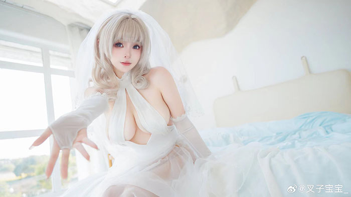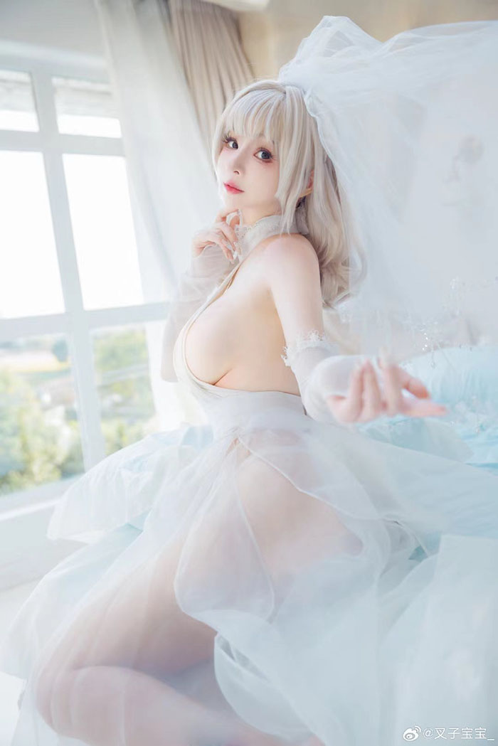 叉子宝宝cos的碧蓝航线SSR吕佐夫婚纱造型,这妹子把婚纱穿成了睡衣战斗服。这衣服设计师和造型整挺好,表面上看着是婚纱,实际上是睡衣,毕竟这个透明的质感,你说是婚纱,还真看不出来,你说是战斗服款式的睡衣还擦汗不多,反正这衣服设计得很有想法。