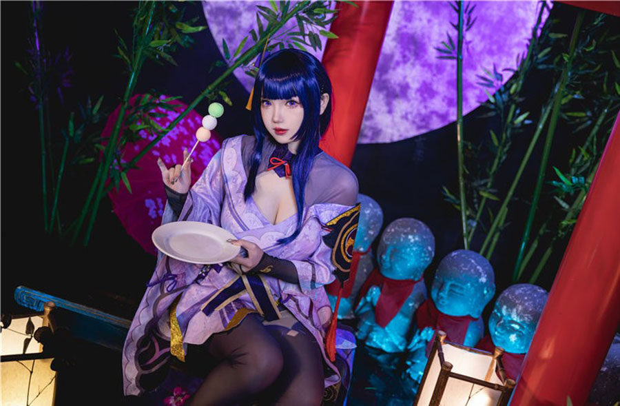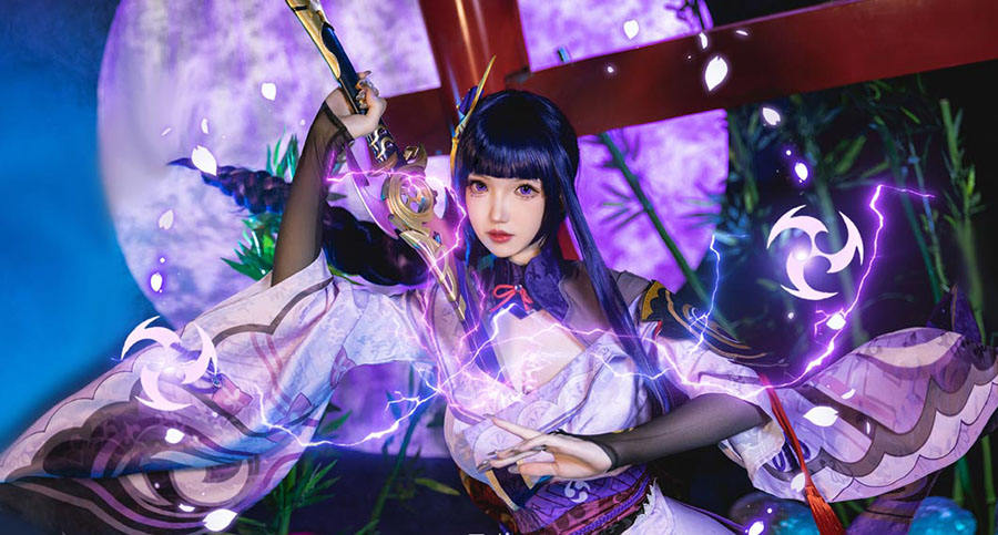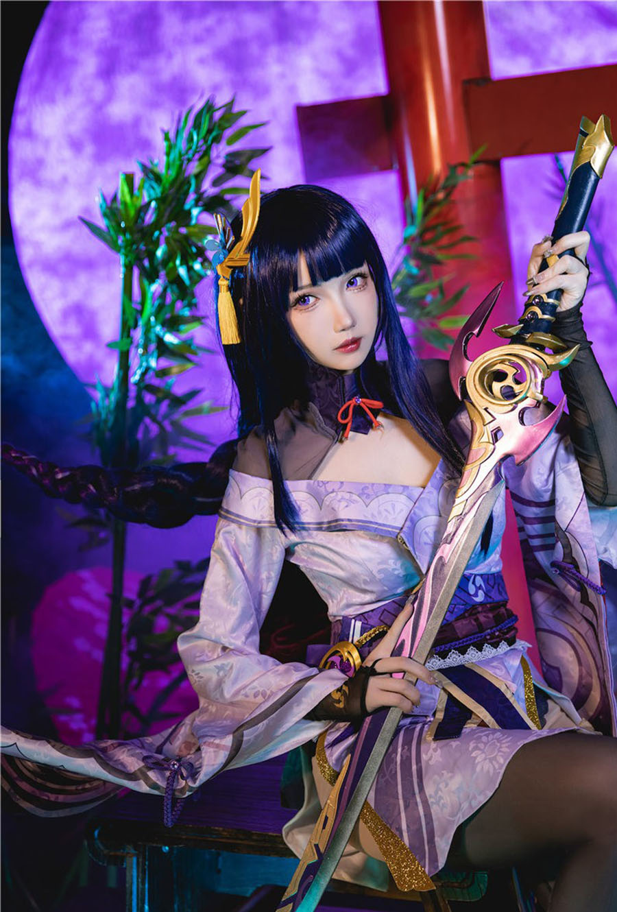 雷电将军是游戏《原神》中的5星雷系角色,叫做雷电将军。雪晴astra的创作灵感就是来自这款游戏了,这一部作品还原度非常高,穿着一件雷电将军制服,手上还拿着一把长剑,周边还有个红木,和绿色的竹子,天上还挂着一个又大又圆的紫色月亮,小姐姐在这个背景下拍摄了图片,看起来就像是一个漂亮的仙女,倾国倾城的容颜,向我们展示了她出色的创意和才华,让我们一起深入探索这个令人惊叹的作品吧!
