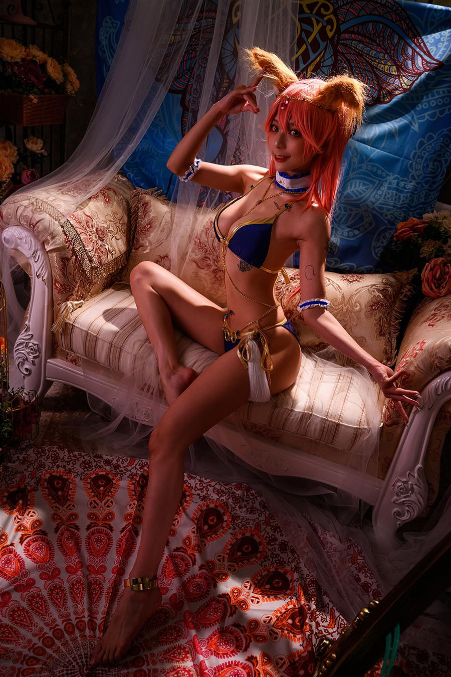 舞小喵cos的众多作品中最让人印象深刻的莫过于她身穿一件连体的黑色皮衣化身地狱魔女的模样了,这部作品中的她上身的黑色皮衣,布料给人的质感宛如漆皮一样,在光线的点缀下反射着耀眼的光泽,也让身穿这件服饰的舞小喵抢足了镜头。皮衣恰巧将她凹凸有致的身材给勾勒出来了。如此妖娆的她一下子就将大家的心给剥夺走了。当四处张望的眼神无意间瞥见她的眼眸时,原本正常跃动的心跳也不禁漏掉了好几拍,她的神态就好似刚喝完酒一样,步入了一个微醺的状态。