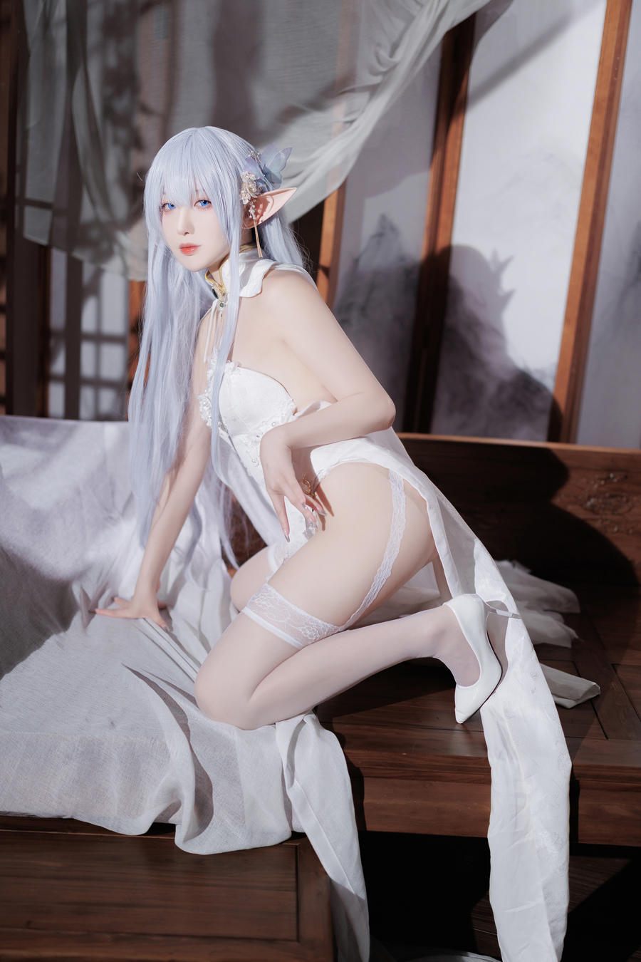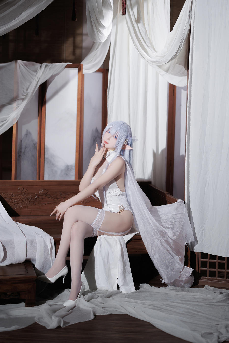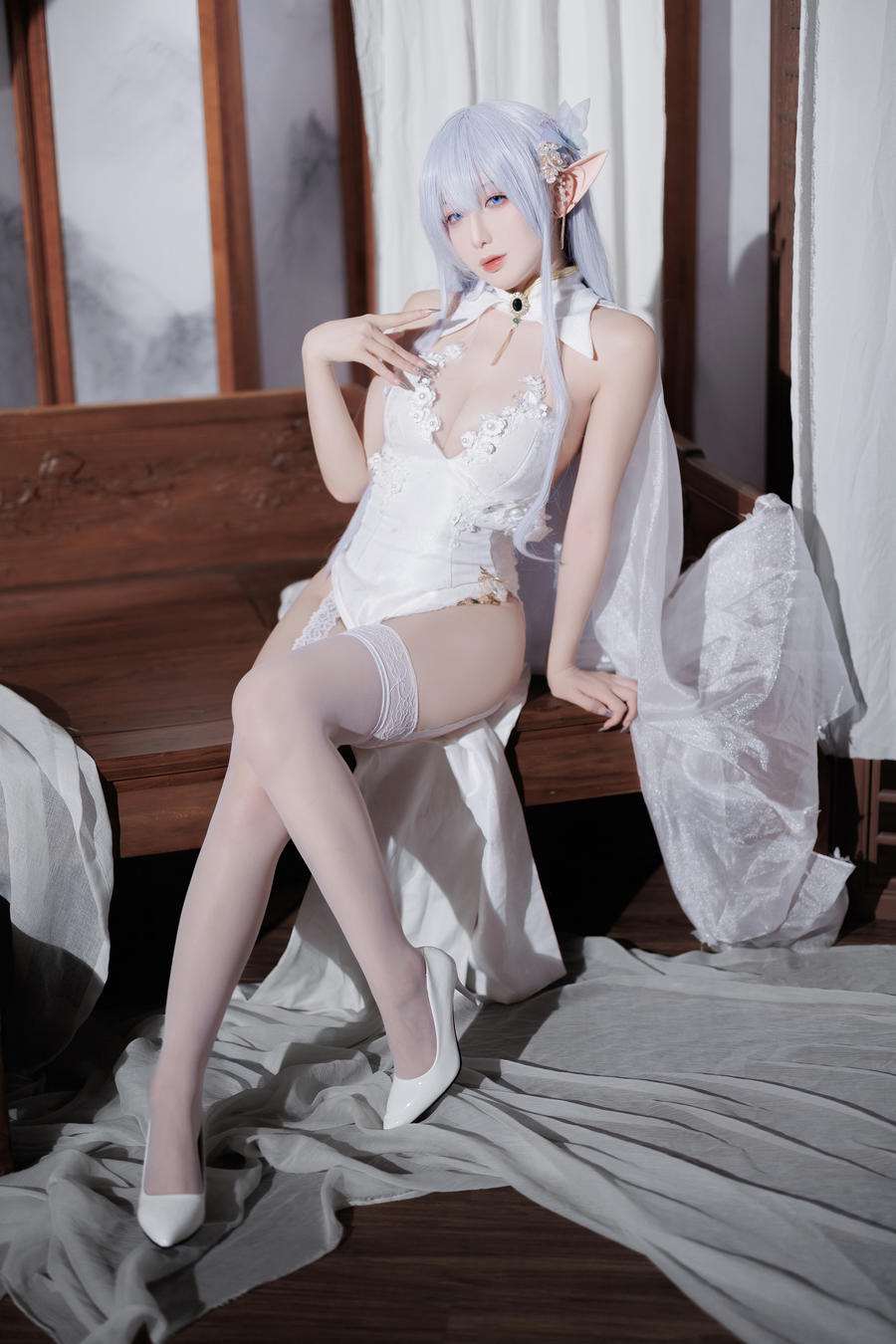 阿尔比恩的旗袍造型是《碧蓝航线》玩家中非常受欢迎的皮肤之一,其设计将西方的皇家风范与东方的典雅旗袍元素结合在一起,别具一格。封疆疆v通过对服装的精心打磨,还原了这件旗袍的精致细节:旗袍上华丽的刺绣、修身的剪裁以及搭配的高跟鞋,都使她看起来既高贵又性感。配合上独特的蓝白色配色和精致的发饰,封疆疆v将阿尔比恩的优雅气质展现得淋漓尽致。