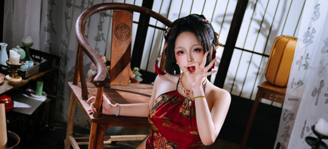 在这次的作品中,日奈娇以战国时期为背景,完美诠释了一个既具英勇气概又充满妖娆魅力的角色。她的服装设计极具层次感,采用了红、黑为主色调,象征着战火纷飞中的强烈情感。细致的绸缎面料与精致的刺绣勾勒出了古典和风的精髓,而肩甲与盔甲的加入,则增添了几分战斗的肃杀气息。整套造型充满了视觉冲击力,仿佛瞬间将观众带入了那个充满传奇的战国时代。