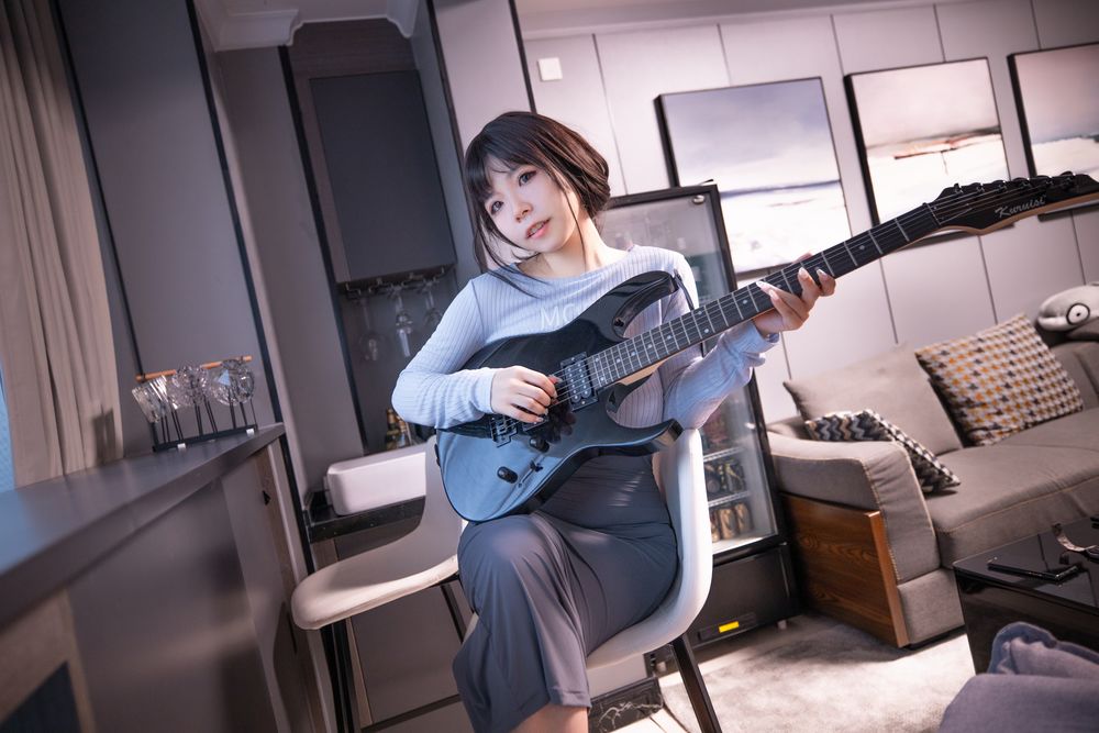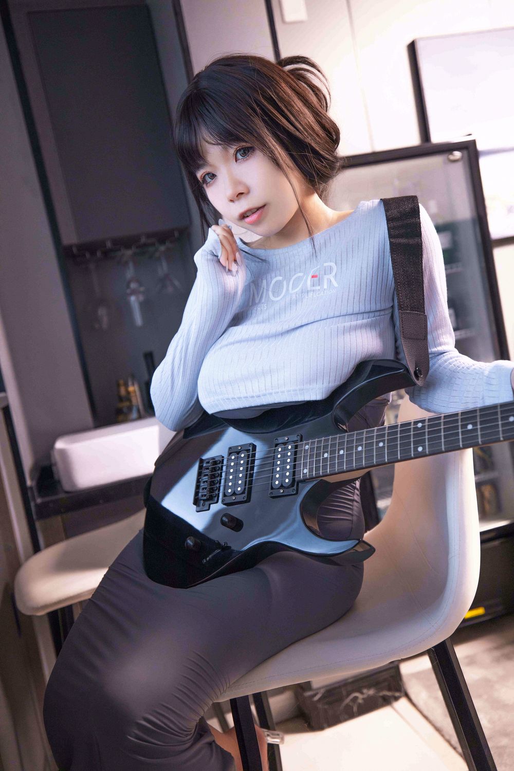 这组作品的亮点不仅在于无颜小天使wy对角色的精准还原,还因为特别邀请了另一位COSER——千反田鹿子加入合作。千反田鹿子以其清纯文艺的气质而闻名,这一次她在作品中化身吉他妹妹的闺蜜或同窗,为整组画面注入了更多的故事性。两人在作品中自然地互动,有一同练习吉他时的专注,也有休息时在长椅上低声交谈的轻松氛围。千反田鹿子的柔和气质与无颜小天使wy的青春活力形成了鲜明对比,使整个作品既富层次感,又充满生活气息。