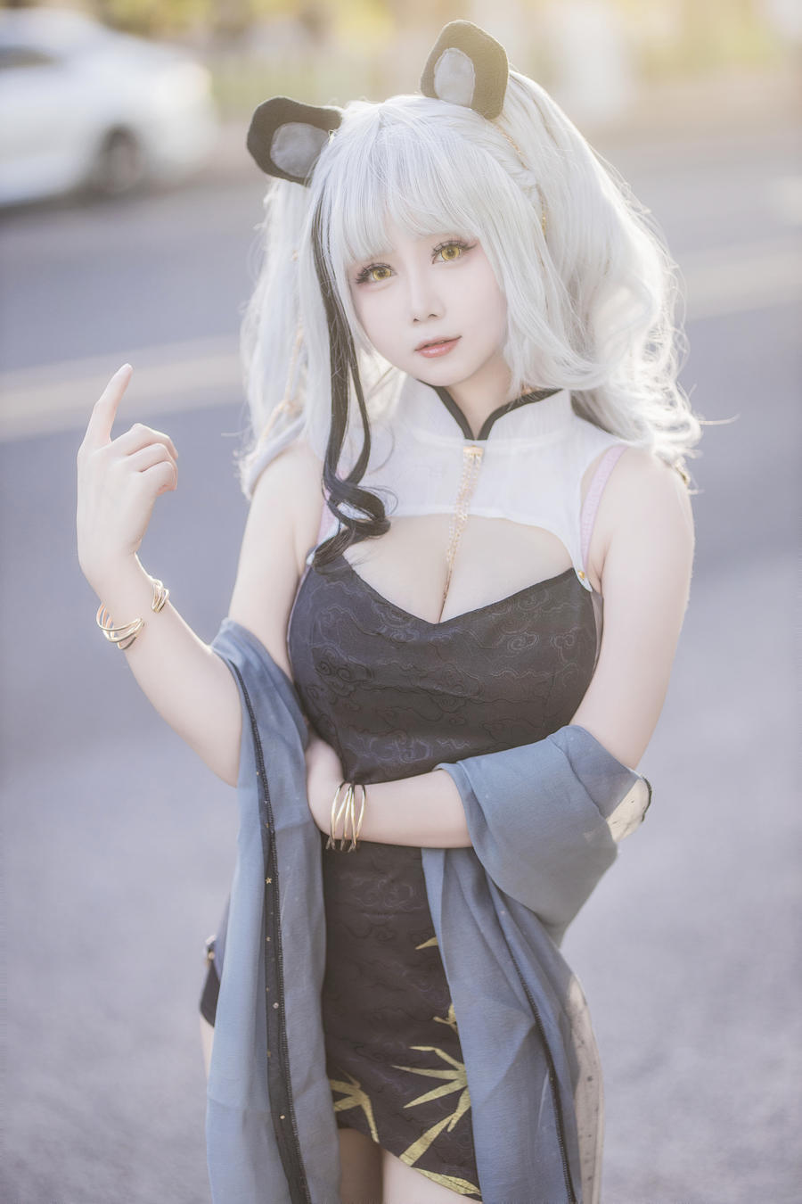 除了末夜787的精彩表现,千反田鹿子的加入也为整组作品注入了别样的活力。她选择了与舰长形成鲜明对比的柔美角色,展现了另一种截然不同的气质。千反田鹿子在作品中以浅色系的服饰与清新自然的妆容出现,为整个场景增添了一丝温柔与治愈。